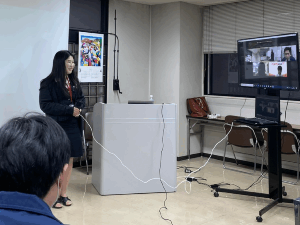 会場内のモニターにZoom受講の皆さんを映し出して実施。マイクとスピーカーを使用して、お互いに意見のシェアを行う際には、話しやすい明るい雰囲気作りを心がけました。
