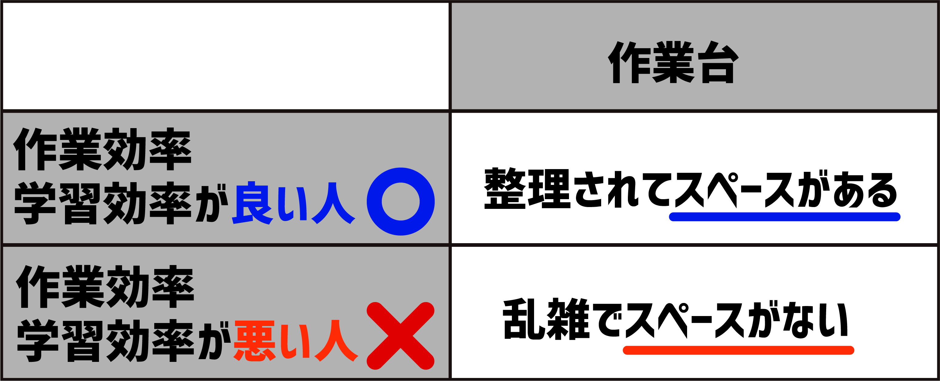作業効率が良い人=学習効率が良い人は、作業台の不必要な道具やゴミをすぐに片付けるのです。逆に