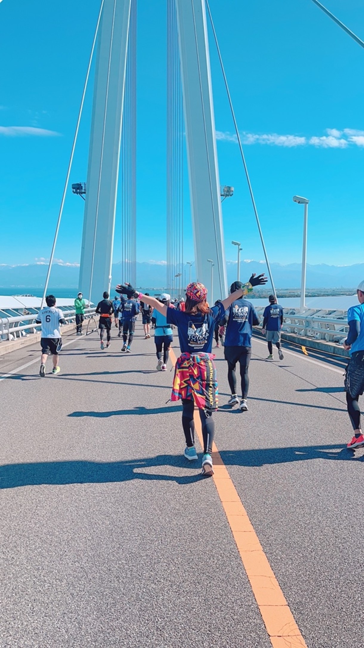 名所②新湊大橋を渡り、橋の上から富山湾と立山連峰の絶景を望むことができる!というもの。富山マラソンのメインであるといっても過言ではないコースをほんのちょっとだけ体験できるイベントでした。その距離わずが4km!!!
