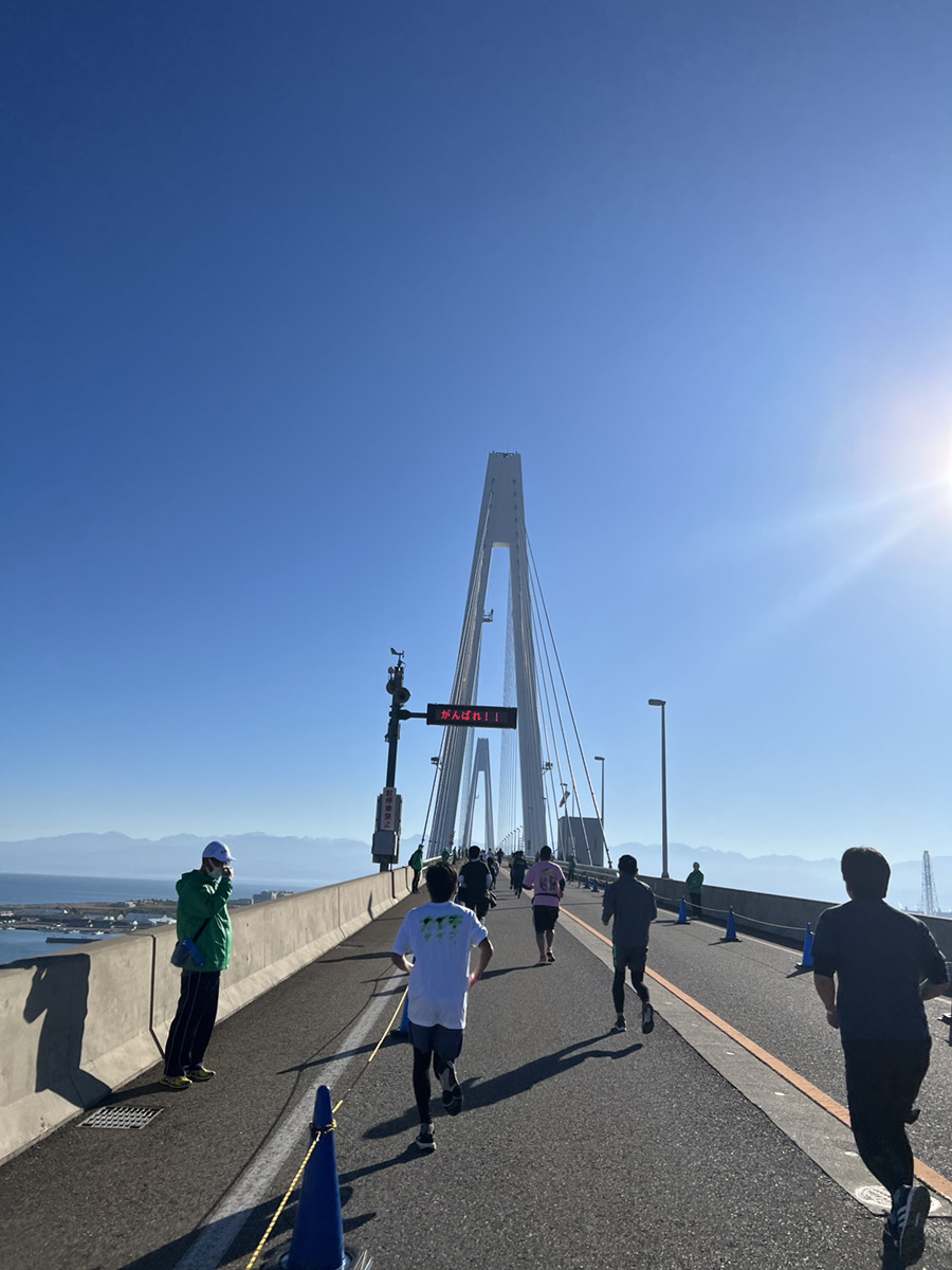 新湊大橋のてっぺんがフルマラソンの中間地点!