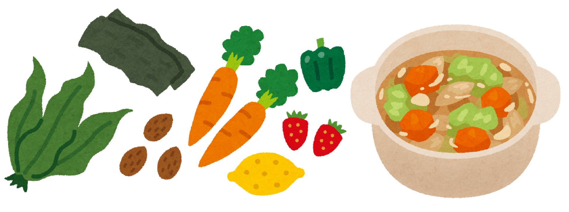 主食からは糖質、主菜からはたんぱく質と脂質をとることができます。これら3つの栄養素を効果的に利用するためには、ビタミンやミネラルが必要です。野菜、海藻、きのこ、芋類、果物などからとりましょう。これらの食材には食物繊維も含まれており、血糖値の急上昇を抑えるのにも役立ちます。